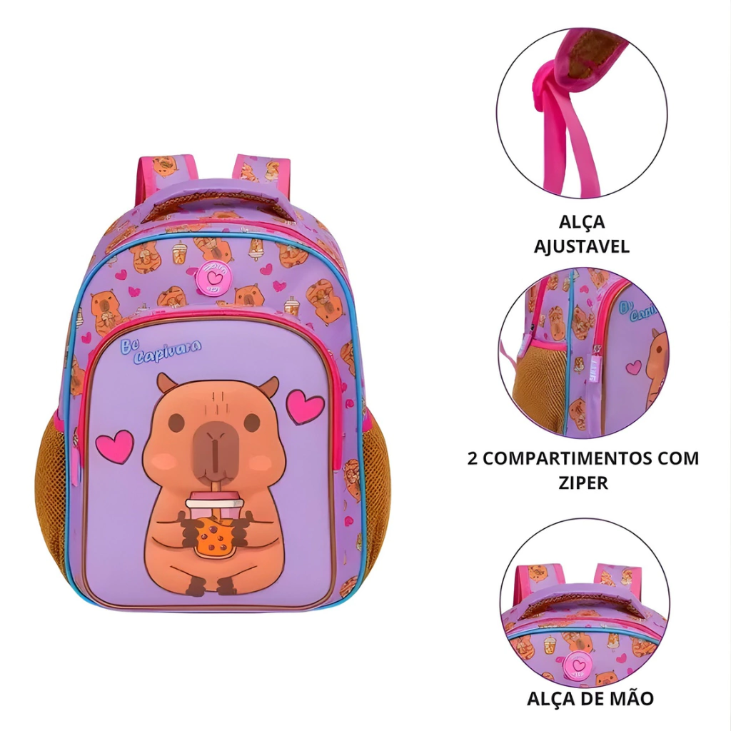 Encante as crianças com a Mochila Infantil Pequena Capivara Yepp, uma escolha perfeita para os primeiros anos escolares! Com um design exclusivo e divertido, ela apresenta uma charmosa estampa de capivara tomando bubble tea, que certamente vai conquistar os pequenos.